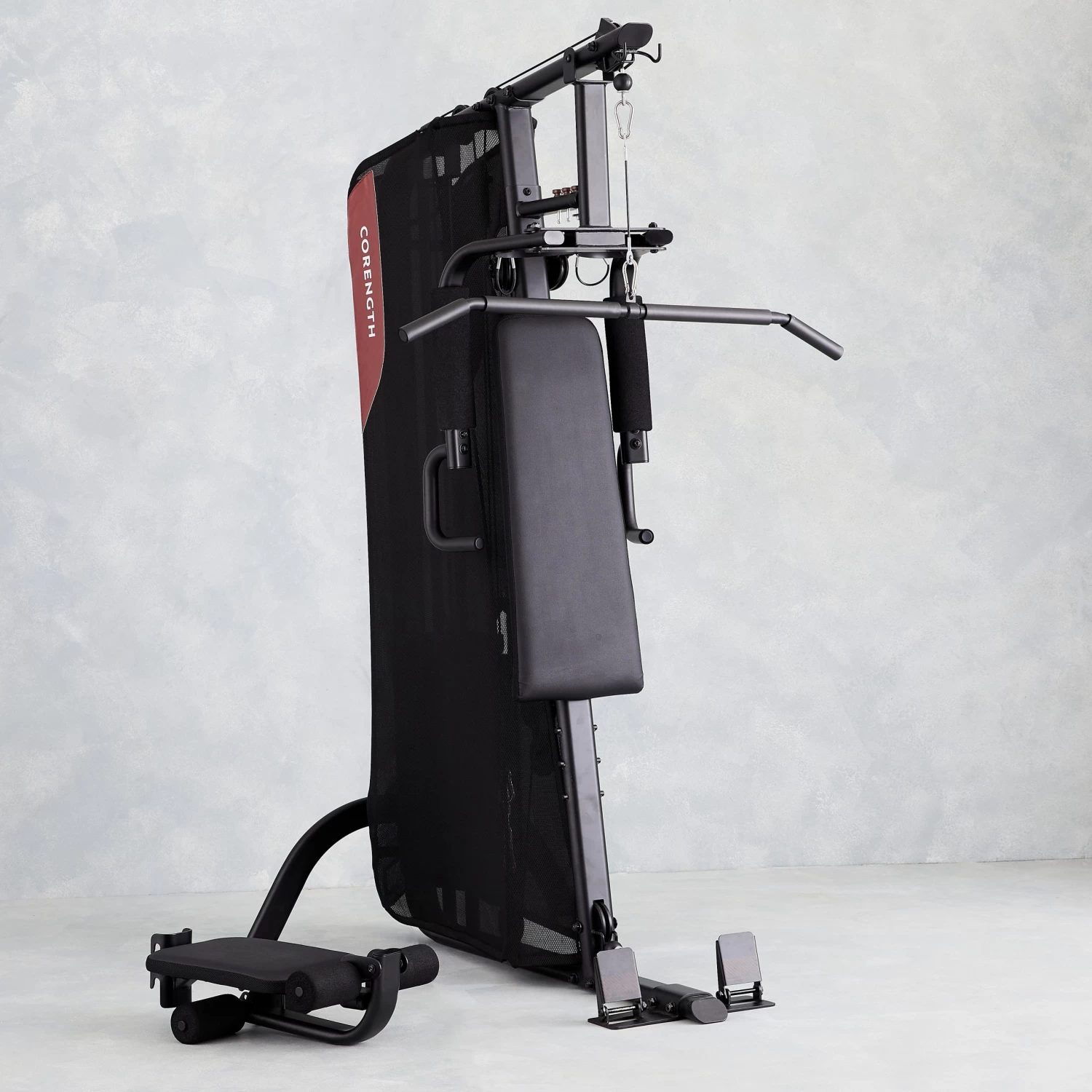 – The footrests can be folded for horizontal pulling.The bonus? You can work all your muscles for a footprint of less than 2 m2 in use, and even less once the product is folded away.