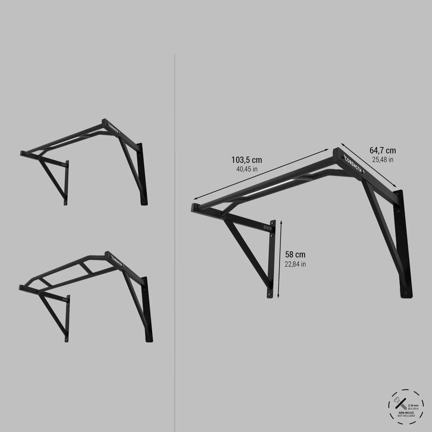 This versatile, wall-mounted pull-up bar can be installed anywhere. (wall screws not provided) Perfect for weight training and dynamic pull-ups.Are you looking for a pull-up bar that can be installed indoors as well as outdoors? You’ve found it! It was designed for weight trainers and cross trainers (dynamic pull-ups).
