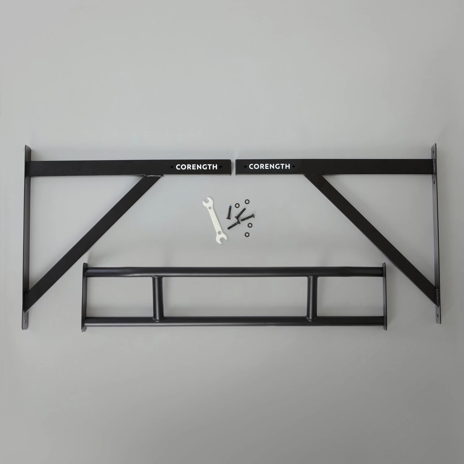 Straight front bar for cross training/kipping pull-ups.The distance from the bar to the wall is 64 cm to allow for sufficient clearance.
