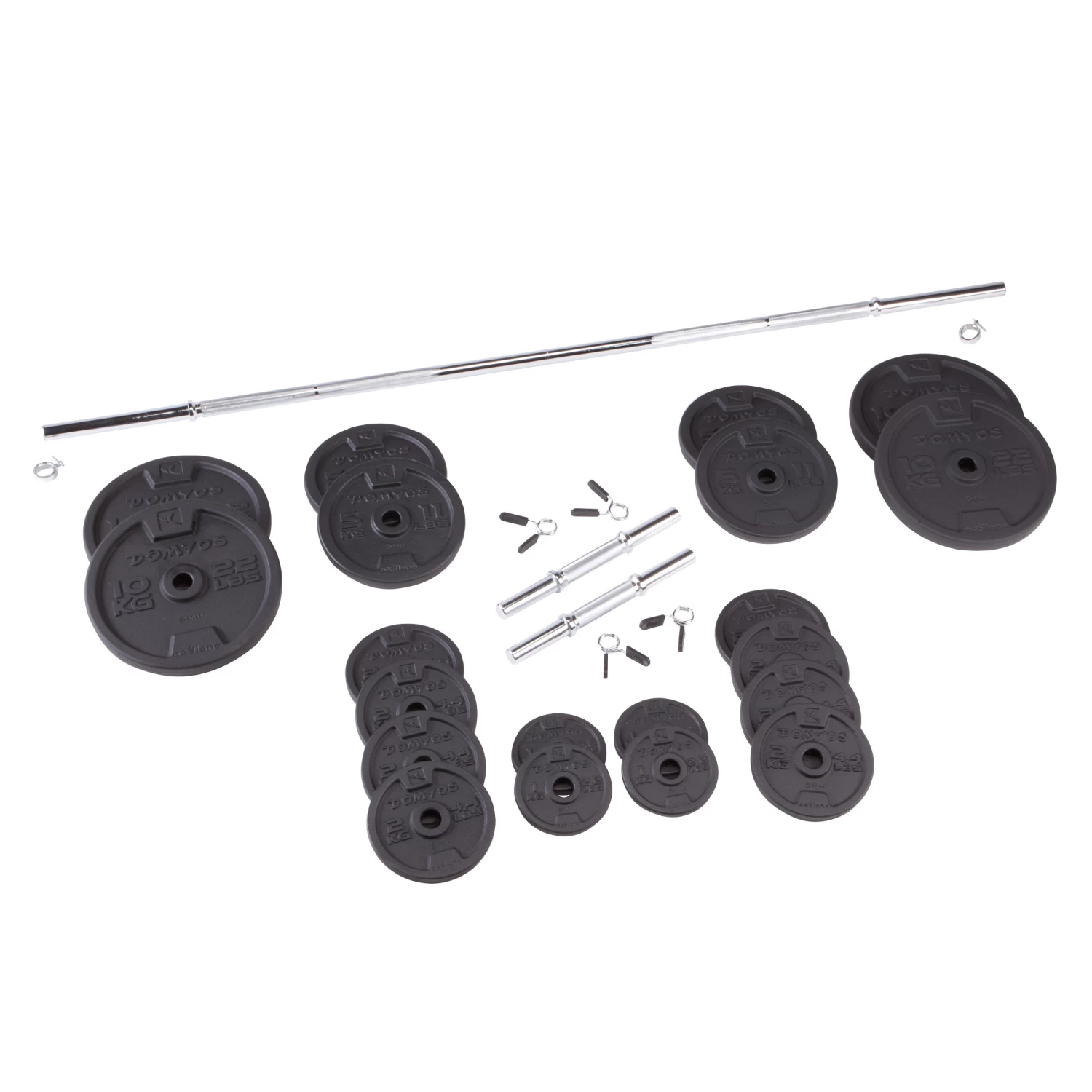 This kit contains 2 dumbbells and a barbell as well as 80 kg of weights for a total of 93 kg. Perfect for varying exercises and making progress!Push yourself to the limit with this kit designed for intensive use and a wide variety of exercises. The solid design of the dumbbells, bar and weights makes this a product built to last.