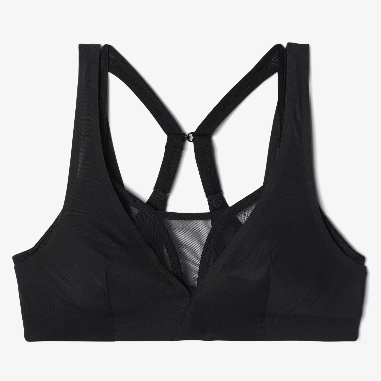 The sports bra’s straps are doubled up:The first can be worn straight, like a conventional bra.They can also be attached to the middle of the back, using a hook.This provides better bust support if necessary.The second set of straps are a little wider and are extend out from the fabric that covers the side of the bust, giving this sports bra its characteristic fine lingerie looks.