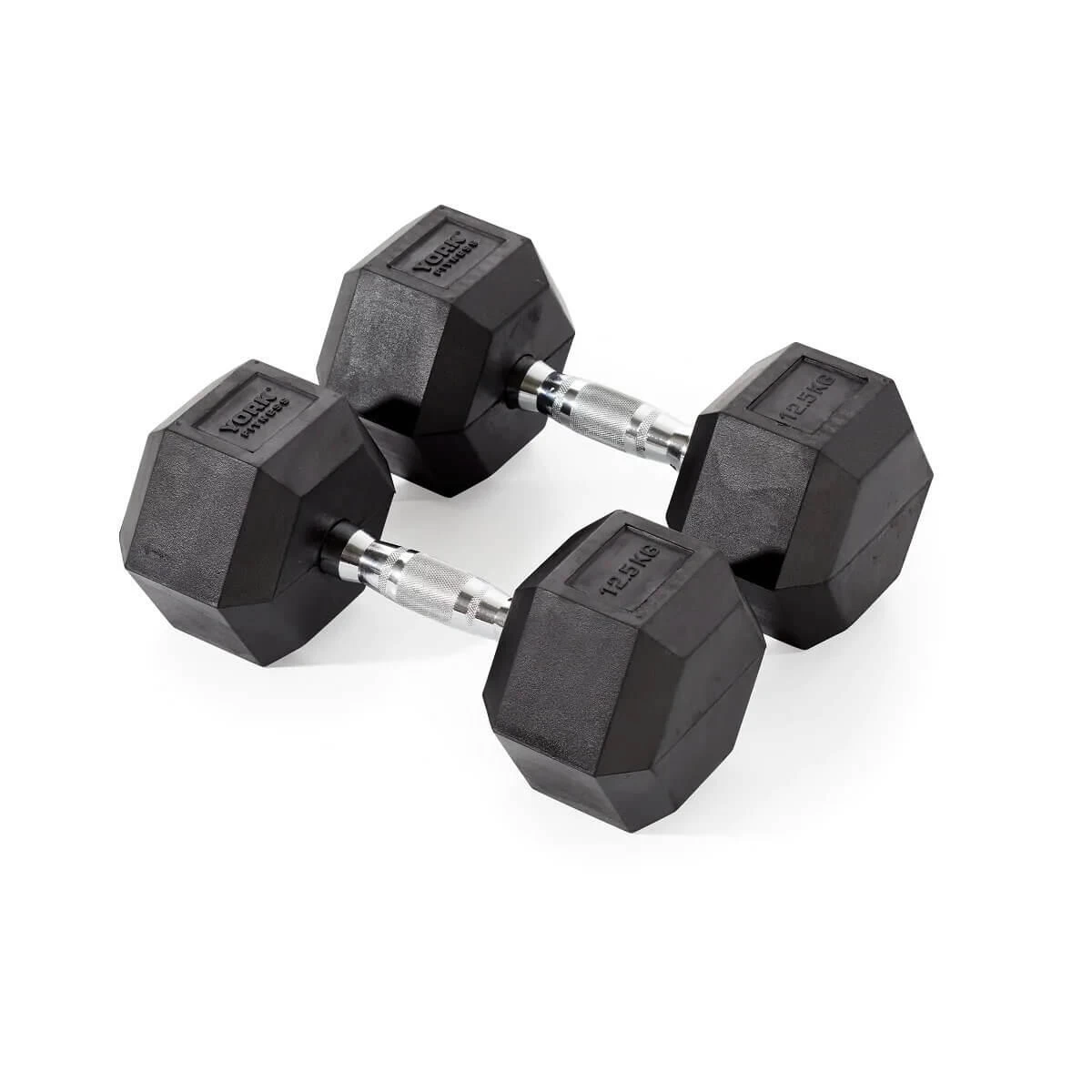 The York Fitness 12.5kg Hex Rubber Dumbbells have heavy duty, rubber encased heads and feature a chrome plated handle that is ergonomically designed for a comfortable feel in any grip style